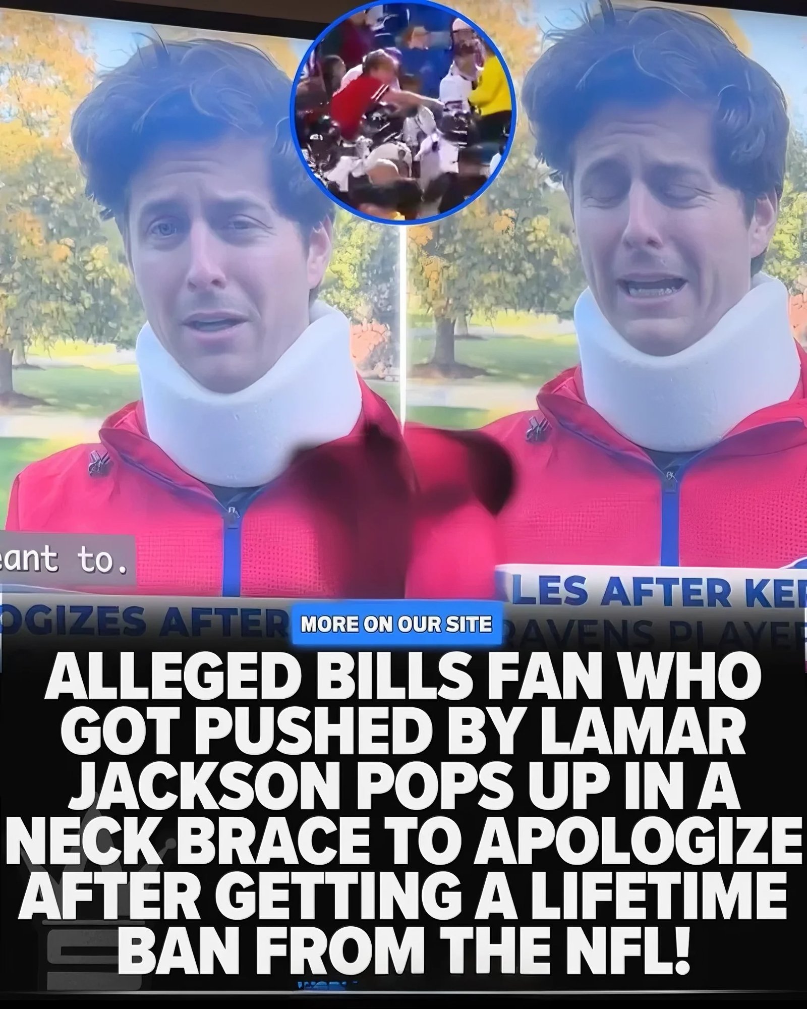 A PAIN IN THE NECK Alleged Bills Fan Apologizes In A Neck Brace After Getting Shoved By Lamar Jackson And Banned From The NFL For Life!