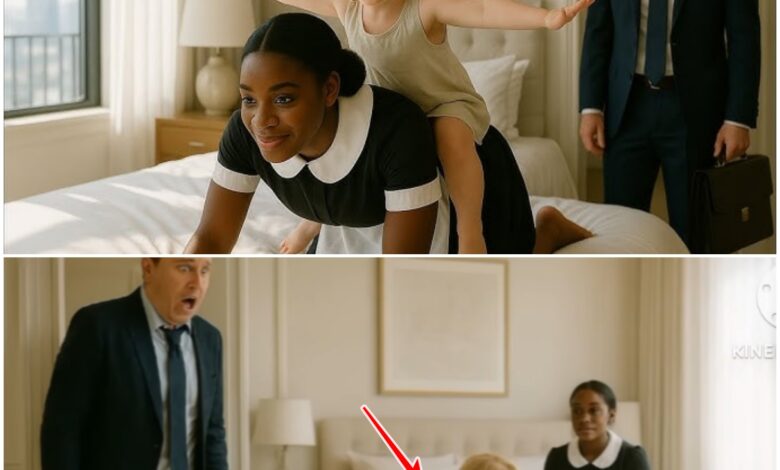 On the bed was Amara, the new maid he had hired just two weeks earlier. Calm and composed, her back straight, she moved slowly on all fours like a living platform. And on her back, gripping her shoulders, was Ella — his daughter, who had never stood, never walked, not even crawled. Ella’s cheeks were flushed with laughter, her small legs wobbling as she tried to balance.