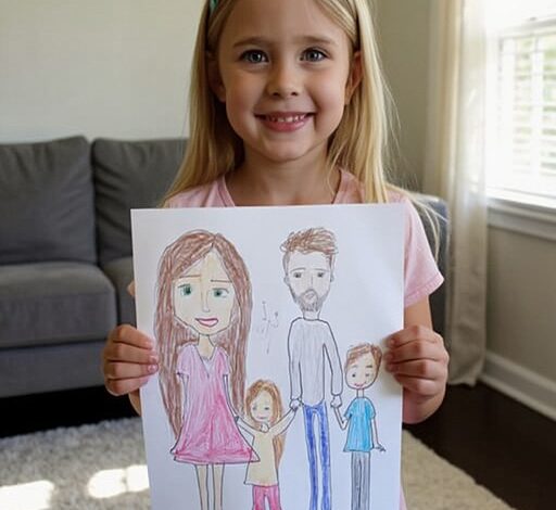 I turned from the stove, spatula midair, and took the paper from her tiny hands. It was a typical kid drawing — uneven lines, bright colors, big heads, small bodies. Me with long hair. My husband, David, with short brown hair and that big square smile she loved to exaggerate. Our daughter in her favorite pink dress, a sun in the corner, flowers along the bottom, little hearts floating above us.